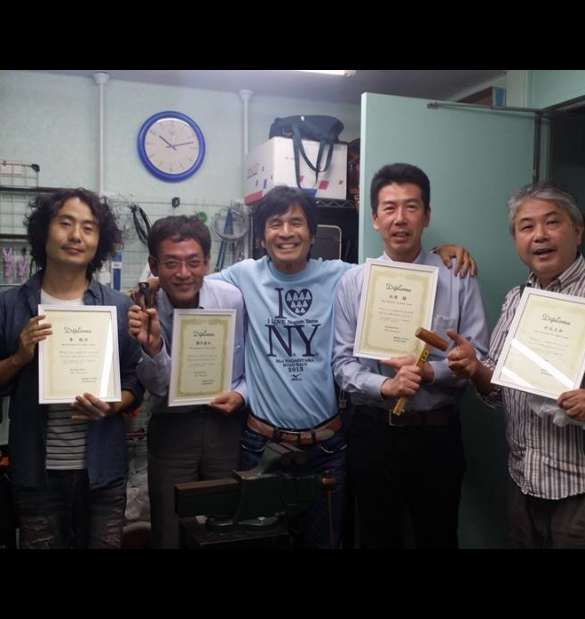 管楽器修理道場では現在まで45名に免許皆伝し、Diplomaが授与されています。写真は2016年授与式の様子。写真左端は韓国のホープ李(イ)さん。ハセカンで受けた薫陶を母国で発揮します。
