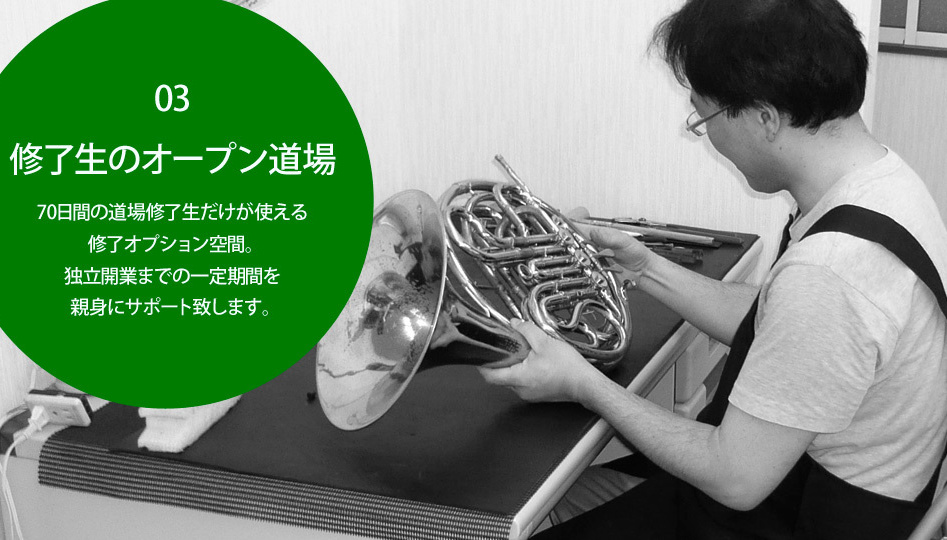 当道場をひとことで言うならば、実技主体に短期間(6か月中70日の研鑽日)で技術を習得できる真の管楽器リペアスクールです。